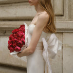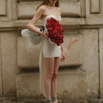 Avoid excessive steaming to avoid damaging the shape of the dress. Keep away from water and heat. When you give it to dry cleaning, make sure it is not cleaned with water. Since it is interfacing, it should not be folded and the front cuff should not be attached to the clip hanger.