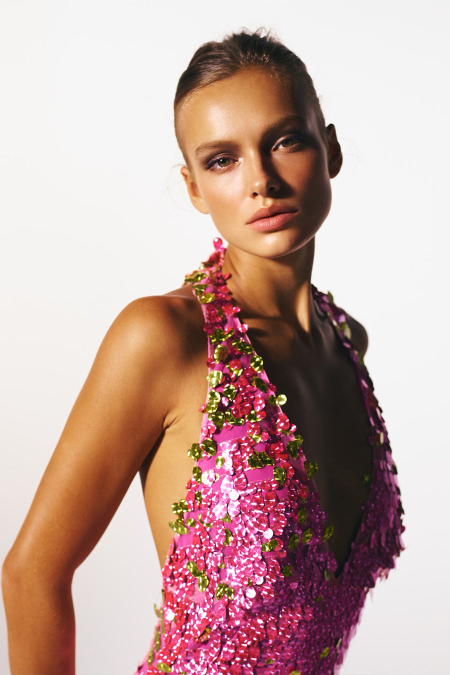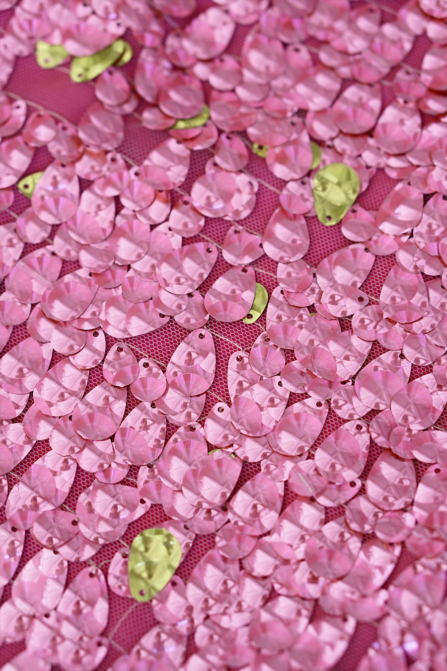 A delicate product, use carefully. Since the sequins are large and dense, they may get stuck together and fall. In case the sequins fall off, complete them by sewing the spare sequins sent with the product. Be careful to sew by hand with a fishing line from a single point to give a 3D form. If the straws are folded, return them to their original shape by steaming them. Store them in a gambot to prevent damage to the straws. Keep them away from water and excessive heat to prevent discoloration.