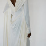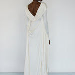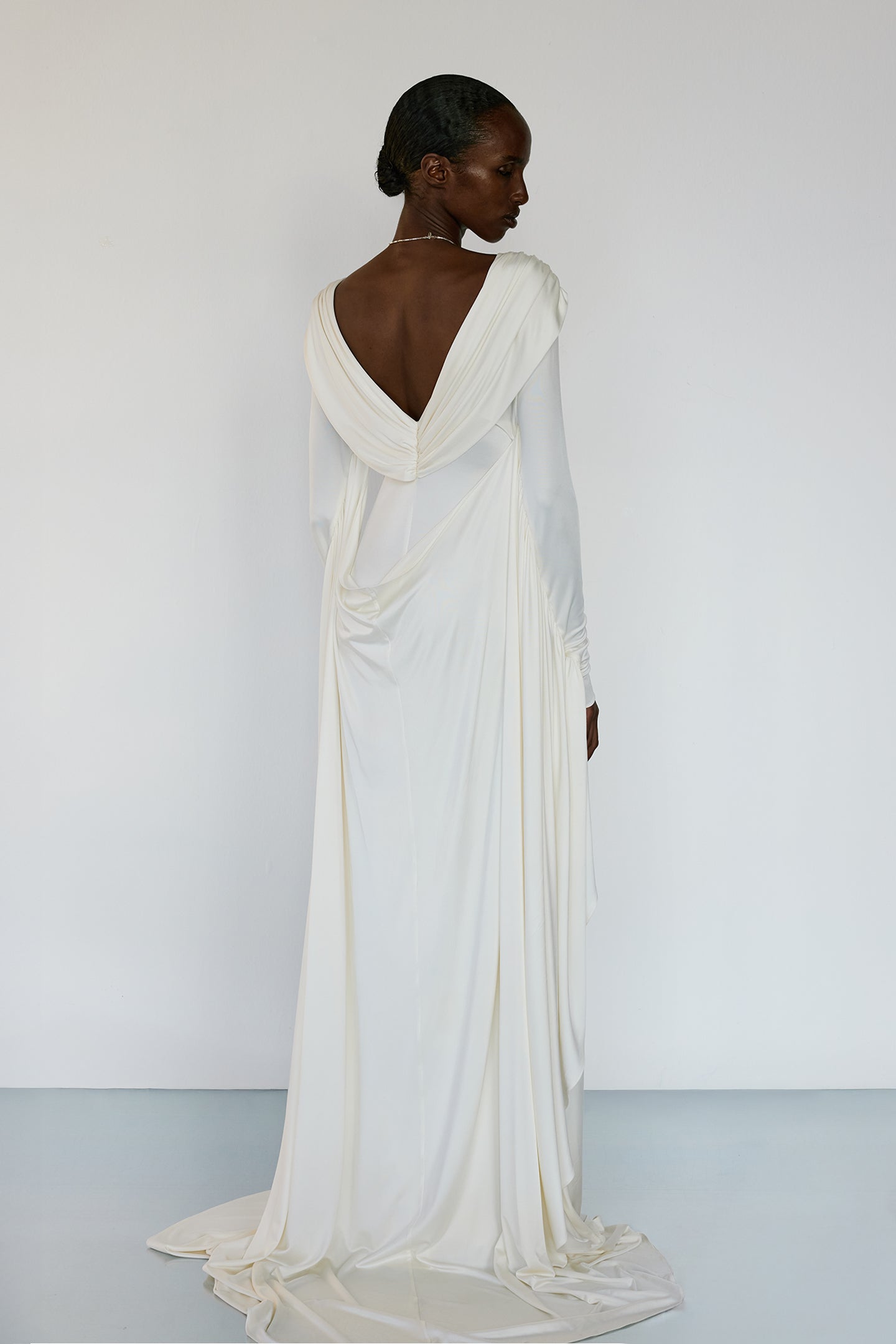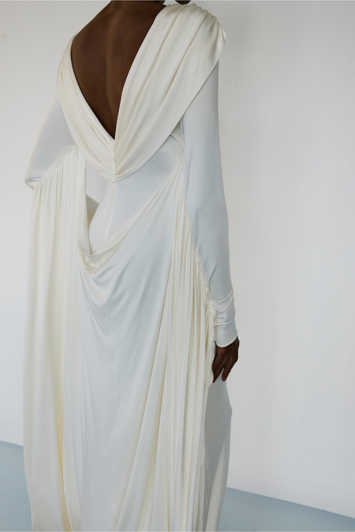 - Kayık yaka; drapeli panelli uzun kol; sırt dekoltesi detayı