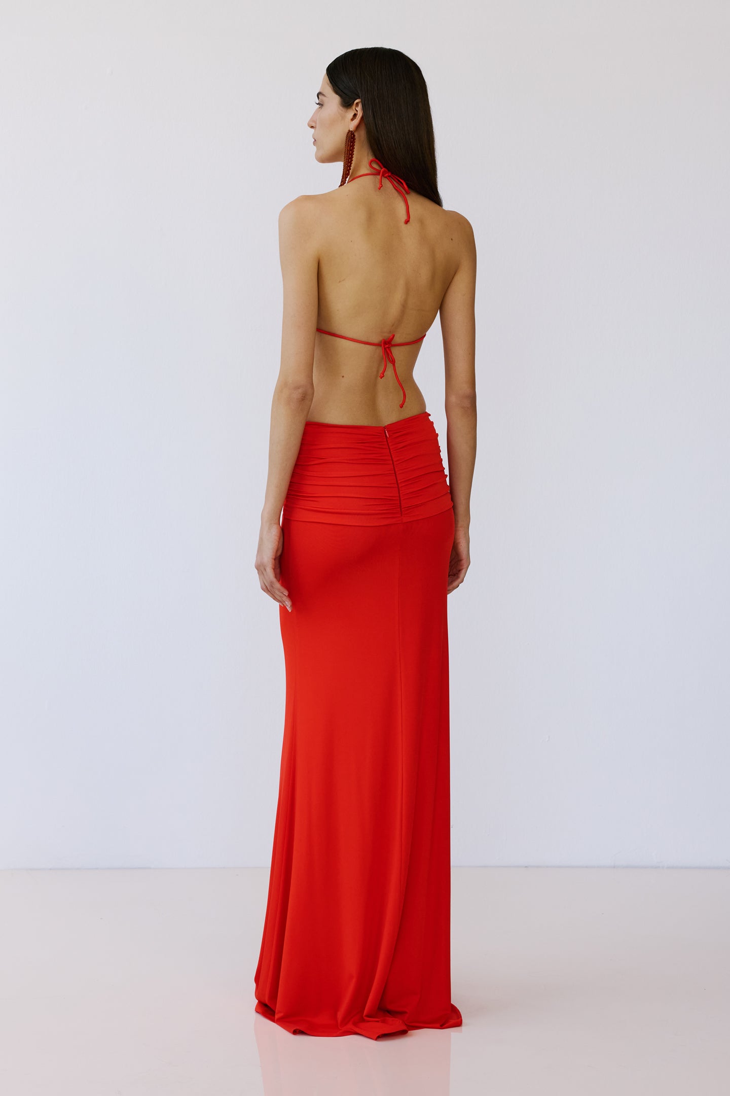 - Kalça bölümünde burgu/büzgü detaylı drape ve aşağı doğru akışkan pileli düşüş