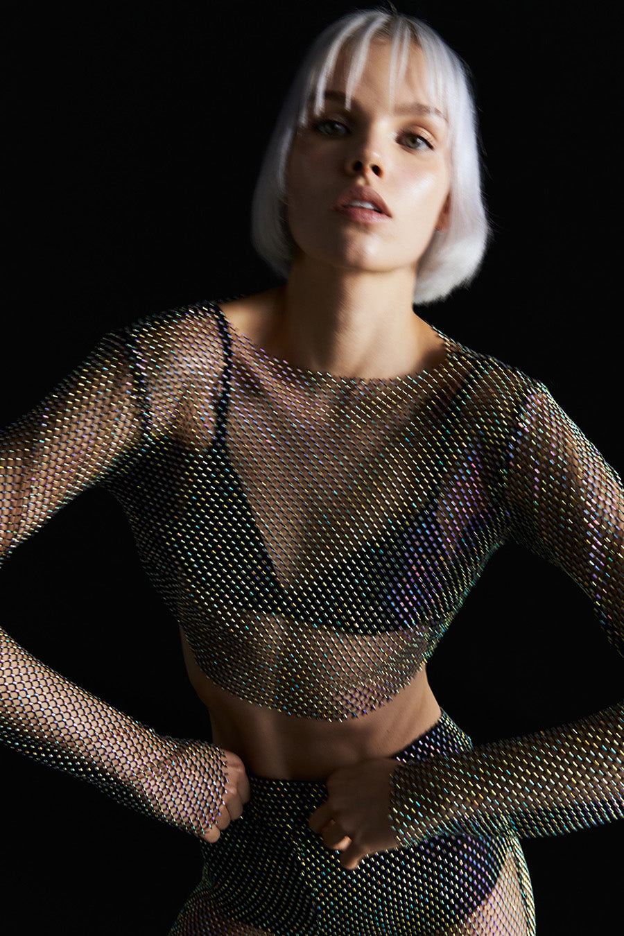 - Taş işlemeli balık ağı kumaştan flare paça pantolon