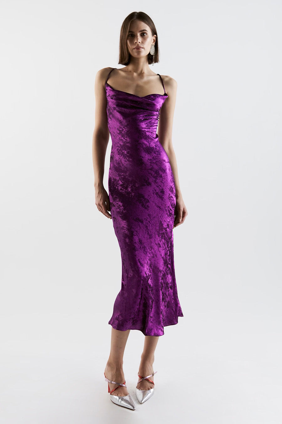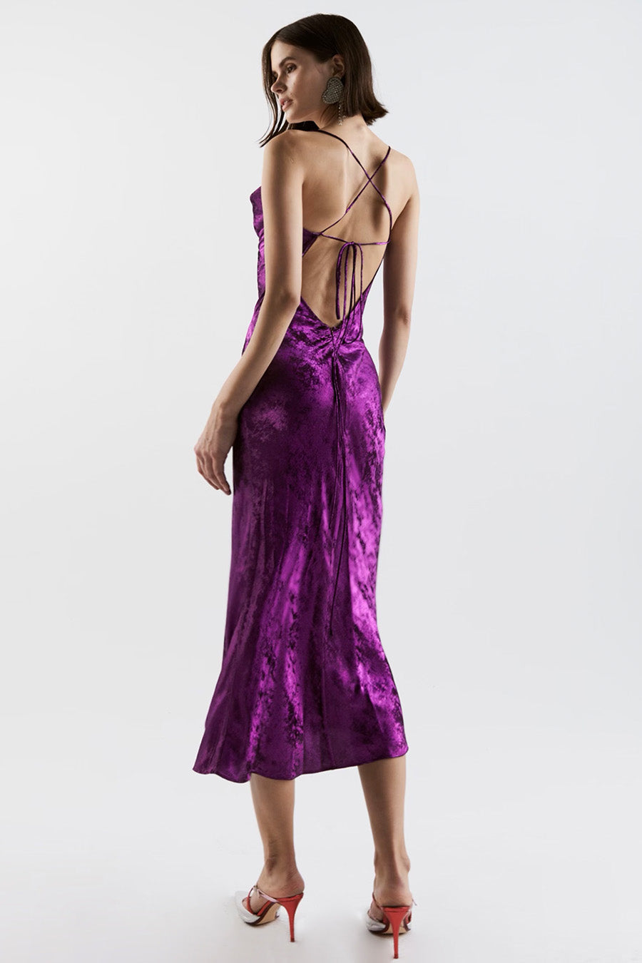 - Verev kesim, dökümlü degaje yakalı, sırt dekolteli uzun elbise