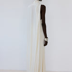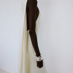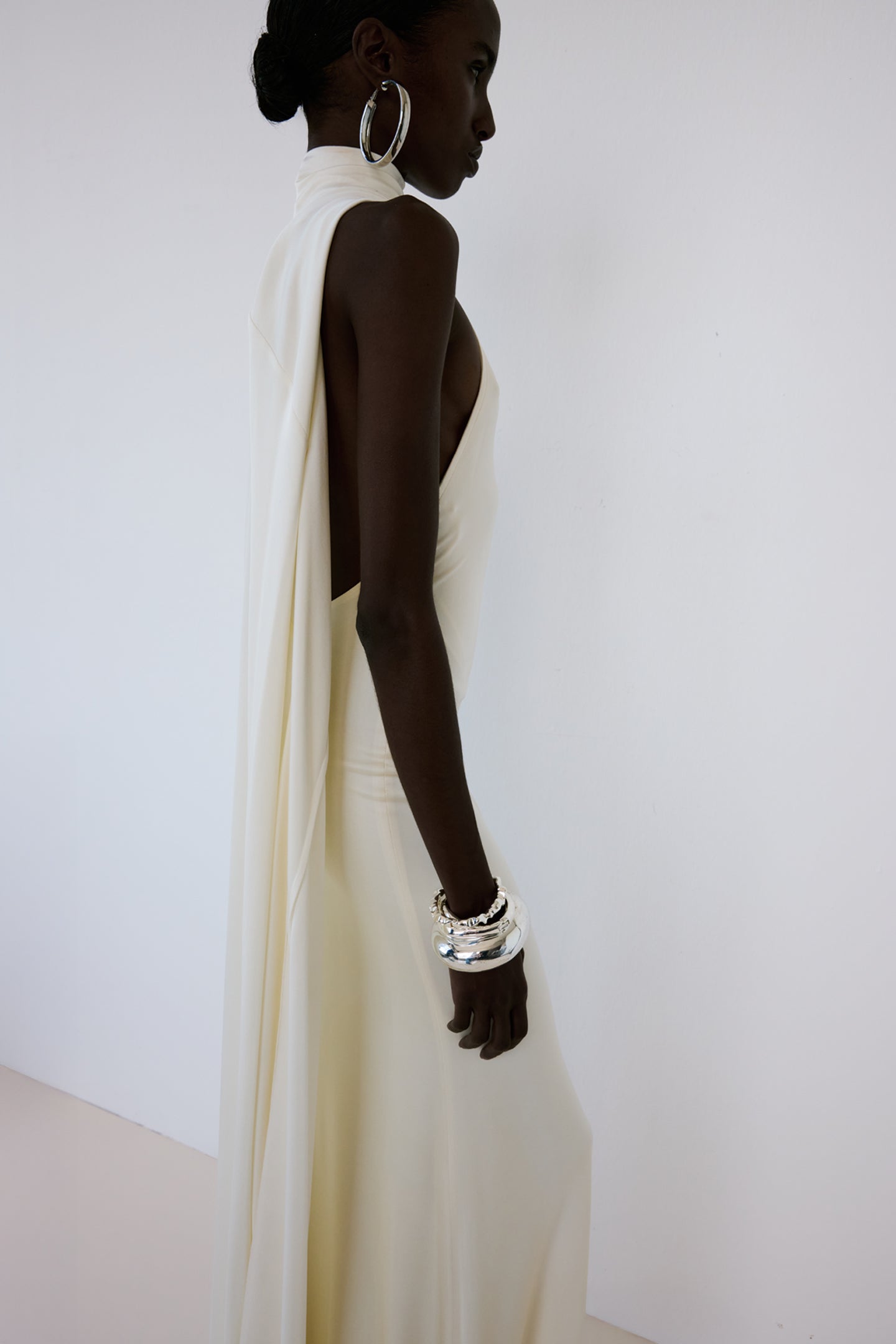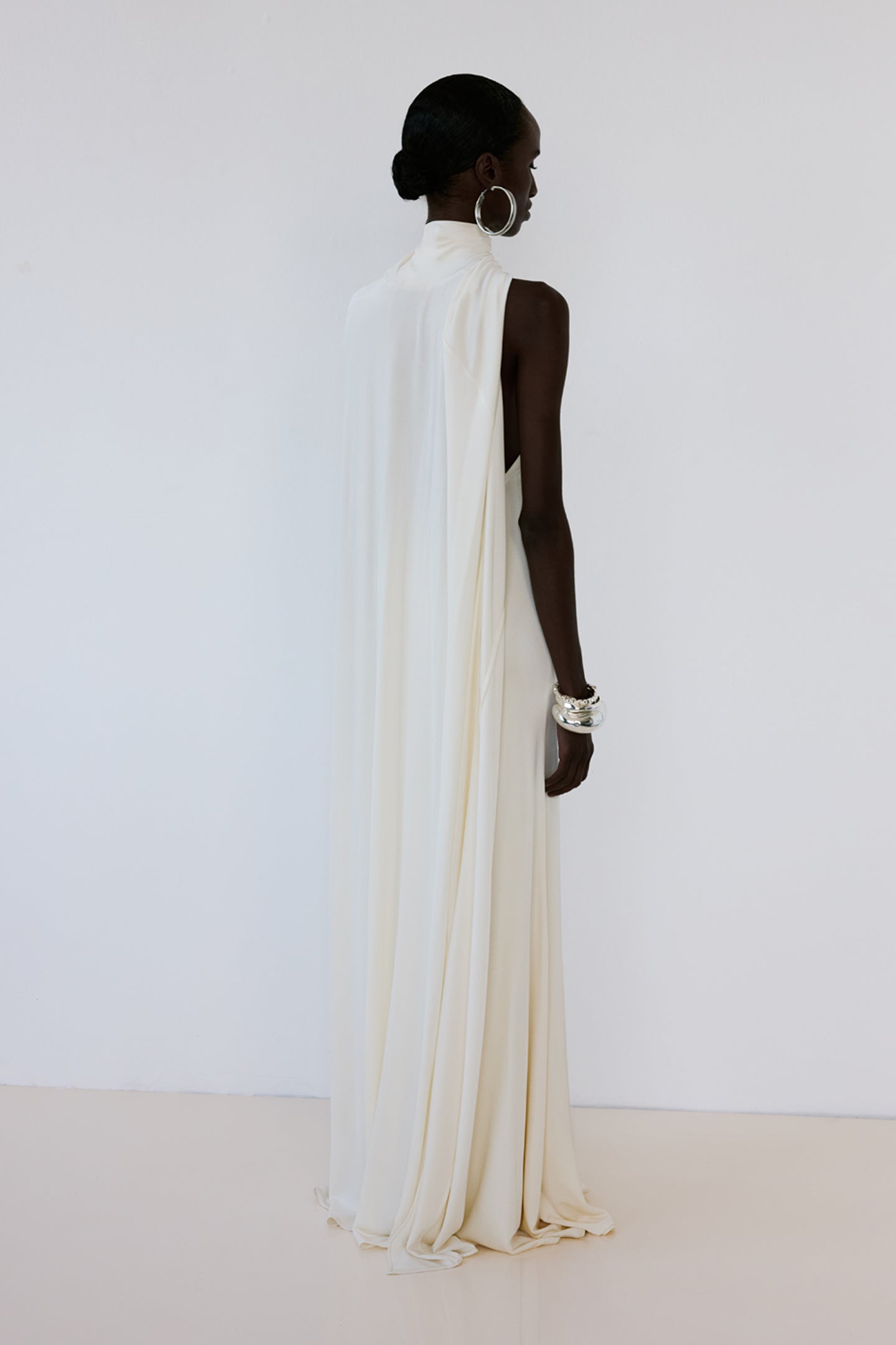 - Yaka hattından aşağı doğru uzanan uzun, akışkan drape